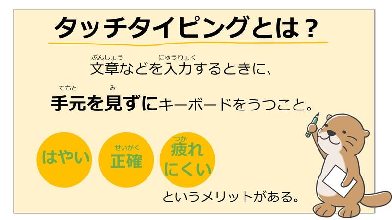 タッチタイピングには、( はやい )・( せいかく )・( つかれにくい )というメリットがある。