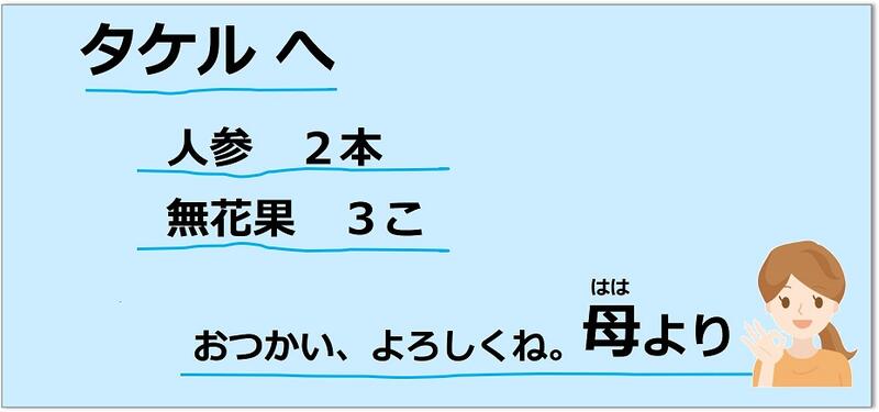↓ ↓ ↓ タケルのお母さんから、おつかいメモ ↓ ↓ ↓